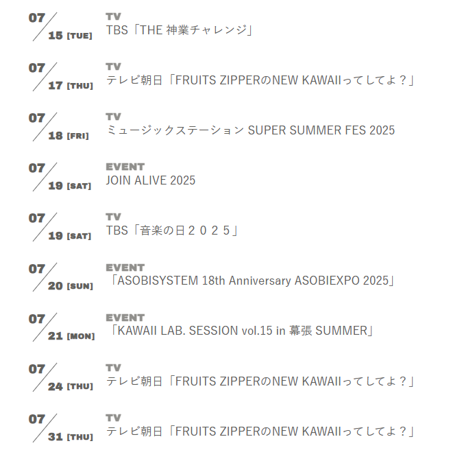 たとえば、特典会から幕張メッセのイベント、さらには音楽番組の出演など、ここ一ヶ月でも、FRUITS ZIPPERの出演が目白押しです。