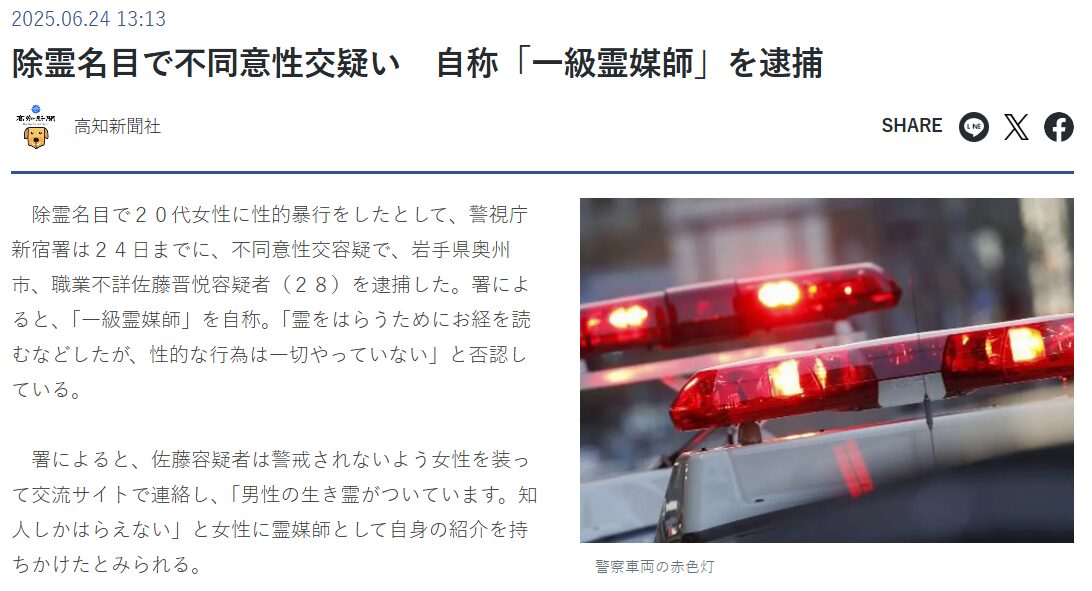 2025年6月24日には、実際に除霊と称して性行為を強要した男性が逮捕されています。