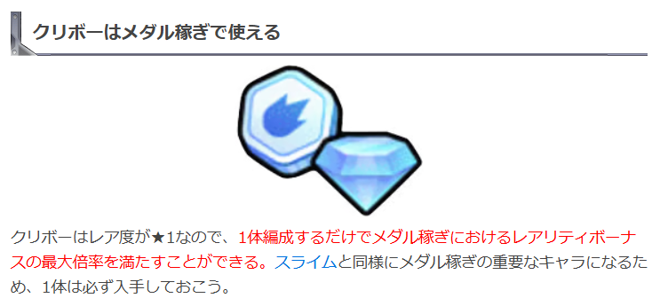 1体編成するだけでメダル稼ぎにおけるレアリティボーナスの最大倍率を満たすことができる」と記載されています。