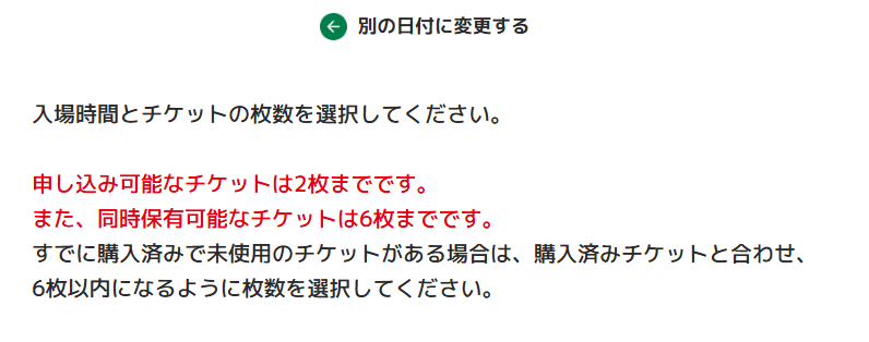 そのため、4名で行きたい時は、2回応募する際に、同日で同日の時間帯に入場できるチケットを選択する必要があります。