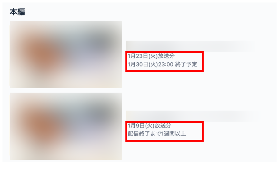 たとえば、「1月23日(火)放送分、1月30日(火)23:00 終了予定」と記載されている場合、1月30日23:00までが「見逃し配信」期間となります。
