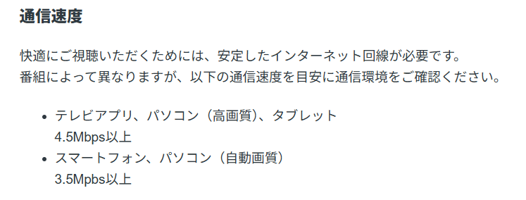 4.5Mbps以上」の通信速度が、快適に視聴できる目安であることがわかります。