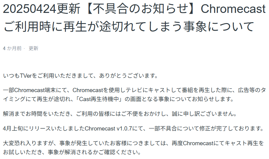 たとえば、2025年4月24日に、Chromecastの不具合でテレビが見れない事象が発生しています。