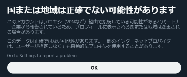 「国または地域は正確でない可能性があります」と表示される理由として、VPN「仮想ネットワーク回線」などを使用している場合とのこと。